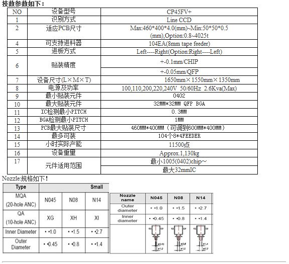 Profile:— 6 placement heads — Servo motor drives X and Y axes — Z-axis mobiles drive system — High precision fixed vision system / flight alignment identification system — Visible range: □32×32mm (0.3mm pitch), connector — Flight alignment system: 1005 (Inch 0402) ~ QFP□ 22×22mm    (0603 inch 0201)~QFP□12×12mm (optional) — Maximum component placement height: 12mm standard — 2D foot bending check — Placement rate: (under optimal placement conditions)    Chip: 0.178sec/piece    QFP: 0.75sec/piece (flight alignment)    QFP: 1.6sec/piece (fixed vision system) The substrate range is 50×30~460×400 T=0.38~4.2mm    Can load 98 (8mm) belt feeders (104 optional) — Safety cover interlock function — Windows 98 software operation — Power supply: single phase 100~240V 50/60HZ — gas source: 5 bar, no water, no oil or dust — Air consumption: 150NL/min