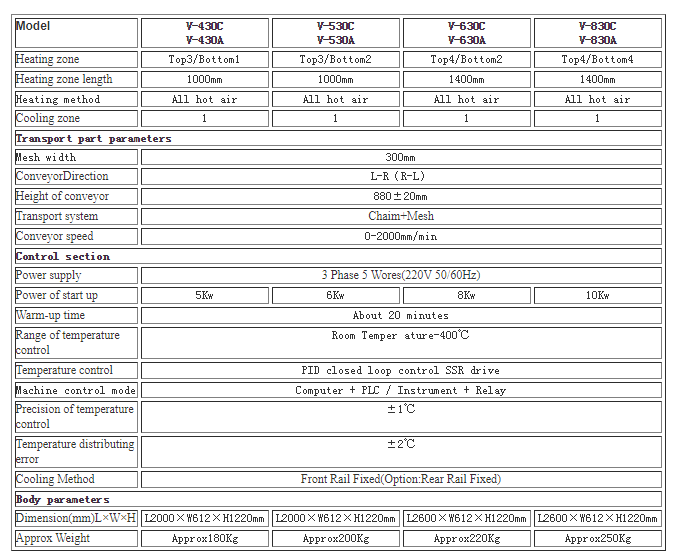 Profile:Features:   Unique advanced longevity heating system •The heating system adopts high-efficiency and energy-saving Swedish nickel-based heating tube. The peak wavelength of radiation power is 4UM. It is equipped with a curved reflector. It has high thermal efficiency and fast temperature rise. The special forced hot air circulation structure system makes the PCB and components heat evenly and completely eliminates “ Shadow effect." • Adopting Swiss CARLO high-current solid-state relay without contact output, safe and reliable, combined with the unique fuzzy control function of the thermostat, it constantly monitors the change of external temperature and heat value, and controls the heating device with minimum pulse to make quickly The reaction ensures temperature control accuracy of ±1 °C, the temperature distribution error within the machine is within ±2 °C, and the temperature distribution in the longitudinal direction conforms to the IPC standard.